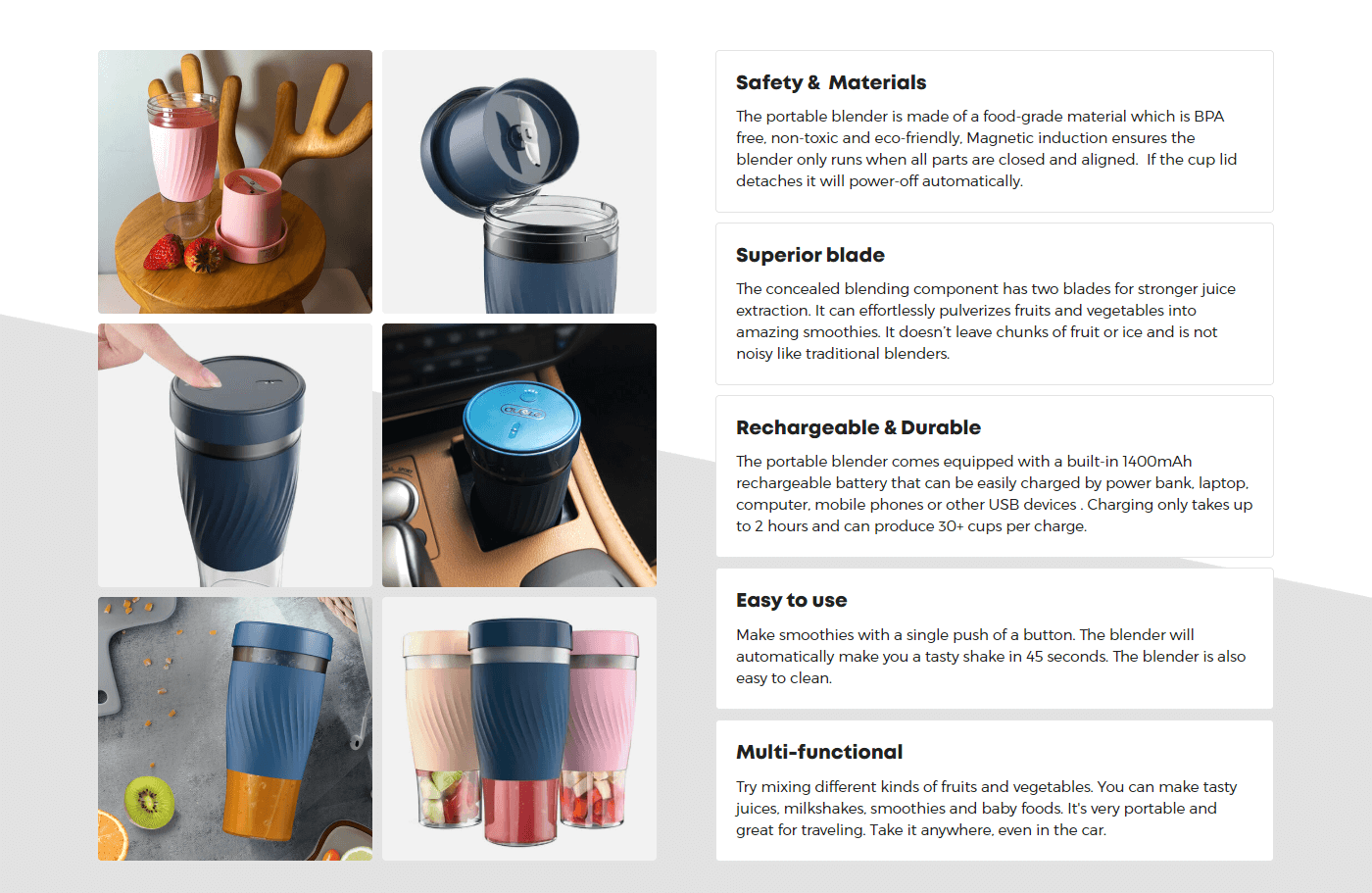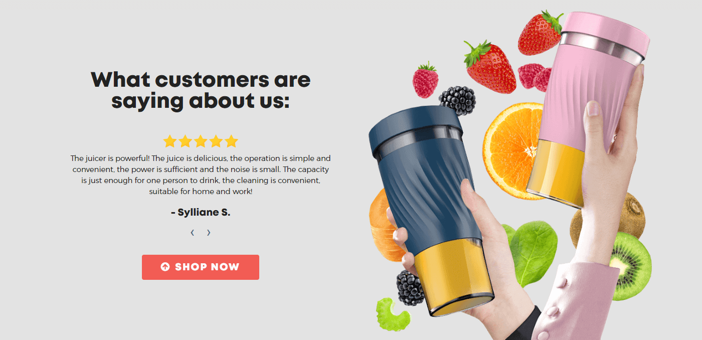 To tackle this, I incorporated bands of color and smoothie ingredients into the hero image to showcase the blender's potential usage. Moreover, I added images of hands holding the blender in the testimonials section to emphasize its 'hand held' design, which is a key selling feature.