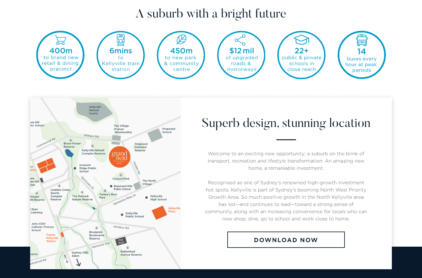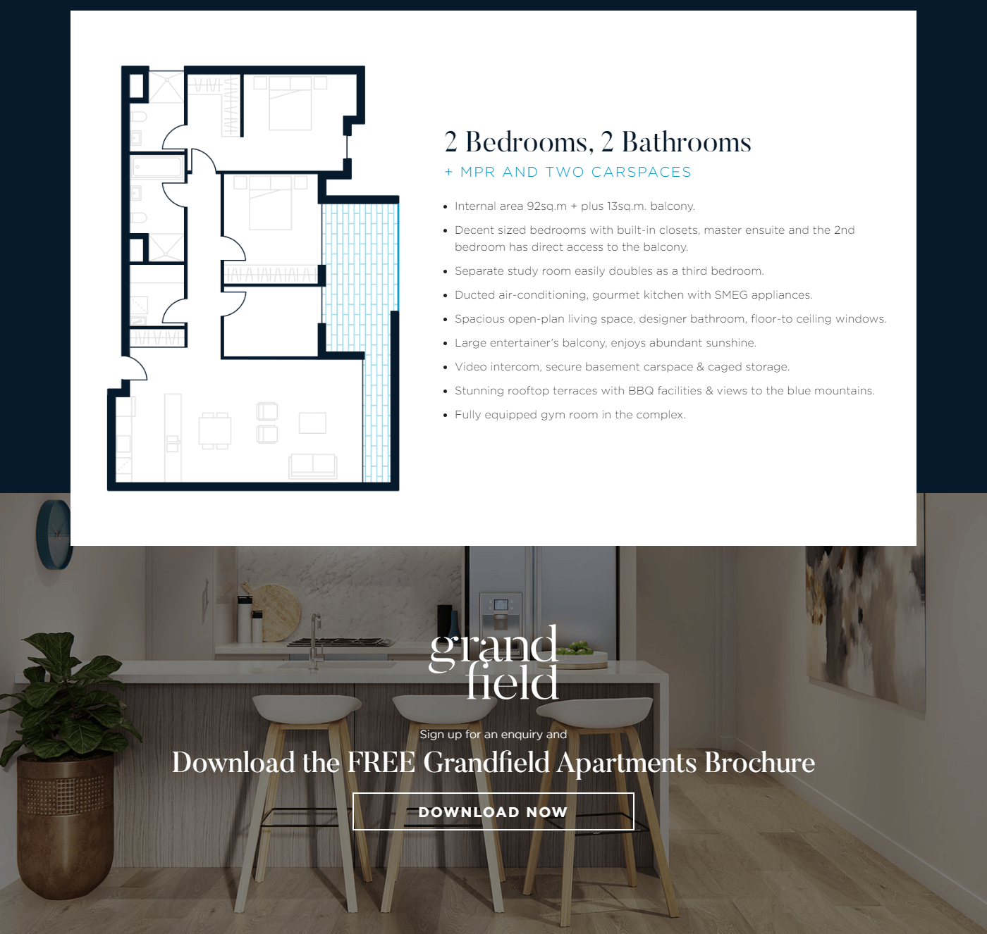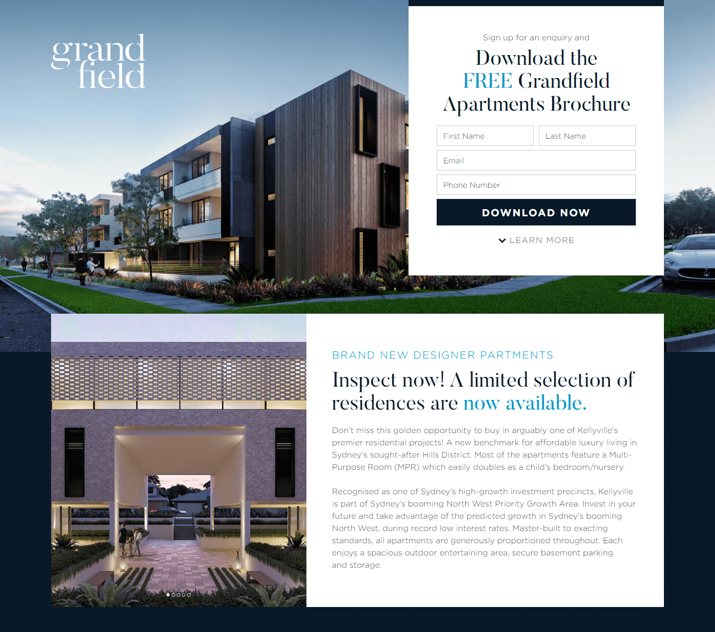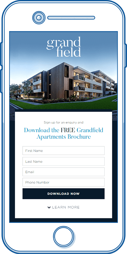 Grandfield Apartments is a condominium development in the Hills District of Sydney, Australia. For their upcoming pre-sale and showroom launch, they wanted a bespoke brochure download page to start generating interest in the project.