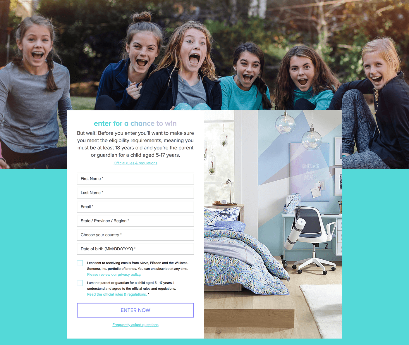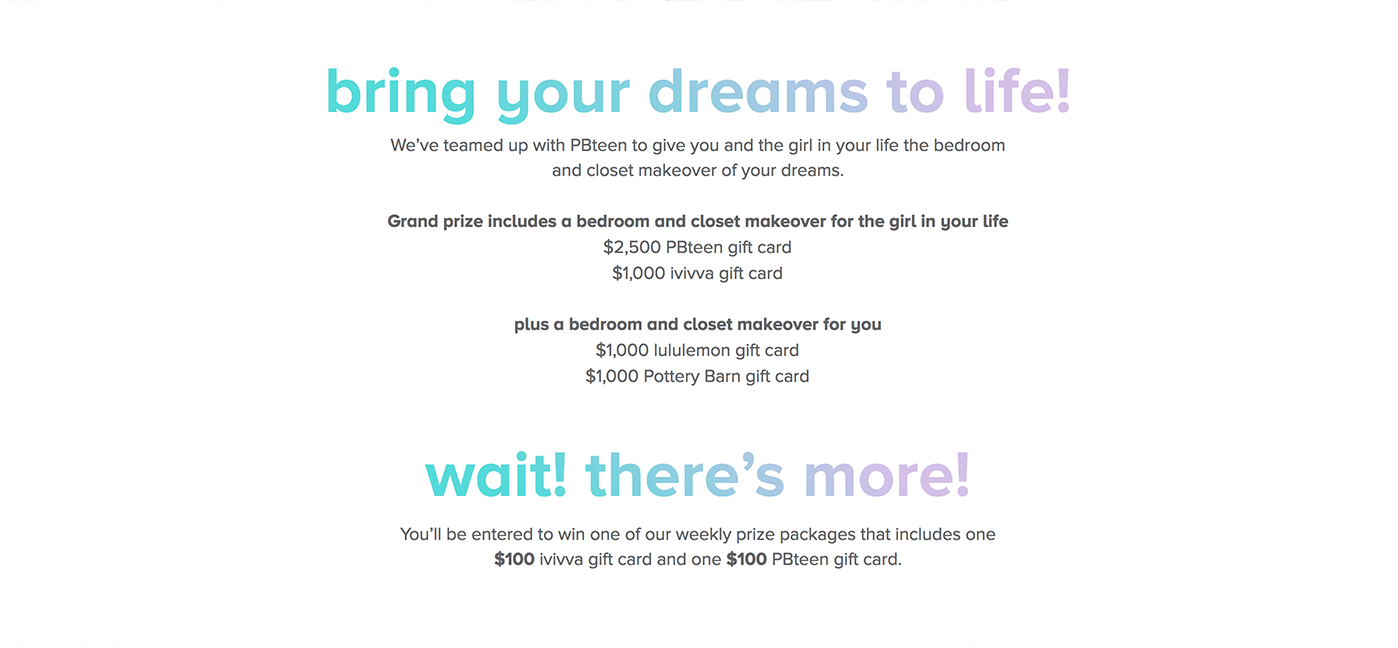 Ivivva Athletica (a division of Lululemon specializing in athletic sportswear for girls ages 6–14) partnered with Pottery Barn’s teen line to host a ‘Bedroom & Closet Makeover Sweepstakes’, aimed at boosting awareness for both sub-brands.